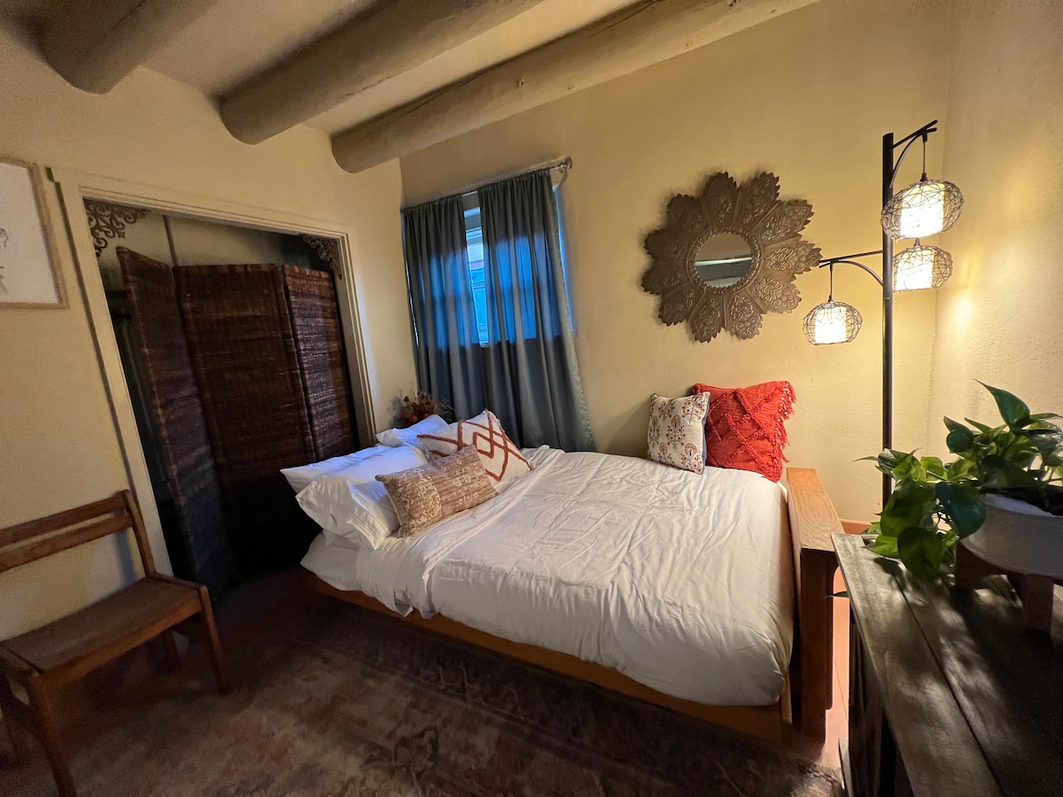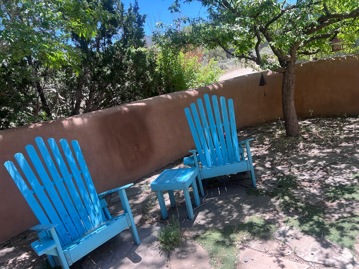 LUGAR PERFEITO PARA UMA ESCAPADA! Uma unidade de um quarto para não fumantes tem muita personalidade. Passeie até a Plaza e os restaurantes. Desfrute do pátio privativo fora do quarto ou do belo pátio com fonte relaxante e muitos bancos. Ideal para leitura, pensamento ou meditação. Muitos hóspedes têm "trabalhado em casa com uma visão diferente"! Um cão de família (menos de 25#) está OK – e você deve perguntar com antecedência. O paraíso aconchegante é uma combinação da vibe Taos com toques contemporâneos.