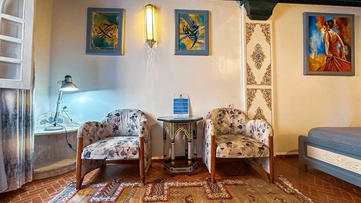 Acomodação tranquila localizada no coração da medina, perto de Ras El Ma. Inclui: 🛏️um quarto com uma cama grande para 2 pessoas (lençóis e cobertores incluídos) 🛋️uma grande sala de estar azul bem iluminada 🍵uma cozinha equipada com geladeira, fogão a gás, cafeteira e chaleira 🚿um chuveiro com água quente, pia, vaso sanitário (toalhas de banho incluídas) ⛰️um grande terraço inteiro não compartilhado em dois andares, com vista panorâmica para as montanhas e a medina. 🌐 Conexão Wi-Fi disponível
