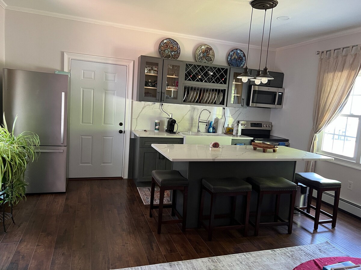 Procurando todas as vantagens de um hotel enquanto fica em uma casa no campo? Este quarto tranquilo e cheio de luz tem vista para pastagens de cavalos e uma estrada de terra no coração da região de caça de Old Chatham. Uma entrada privativa leva a uma suíte de hóspedes que inclui uma cama tamanho queen, área de estar, cozinha acoplada e closet. Localizado no primeiro andar de uma casa recém-construída, com consumo zero. A energia vem de painéis solares e de água solar, proporcionando chuveiros quentes sem culpa! Internet de fibra ótica de 50 MBPS!