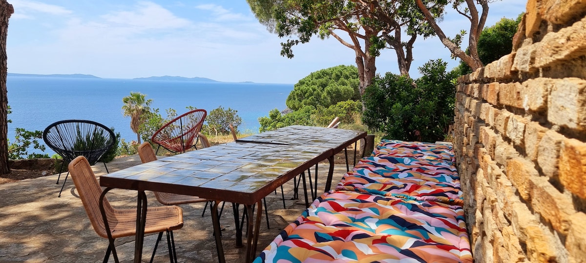You will be our only guests in our heaven of peace! You have the option of renting either our luxurious 33 m2 (353 sq2) studio, equipped for two people, or this same studio plus an extra room, for four people maximum (60 m2- 642 sq2 total) You would benefit from a 86 m2 (920 sq2) private terrace with a 180° panoramic breath-taking view on the Mediterranean and the Îles d’Or, as well as an amazing pool reserved only for our guests, overlooking the villa, with an equally incredible view!