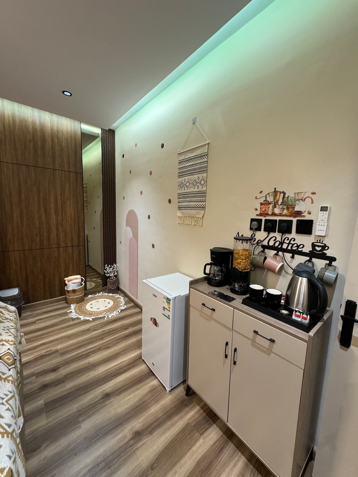 Quarto e sala de estar boémios embutidos que combinam conforto e estilo Estacionamento privado Cama de colchão acolhedora para cama de hotel Armazenamento de cabeceira Roupeiro de vidro elegante Corte de cabelo elegante com um design moderno Ecrã 4k de 65 polegadas Todos os acessórios para o canto do café O frigorífico oferece espaço suficiente para guardar bebidas Cuidadosamente equipado com produtos de banho descartáveis Sala de estar tranquila e elegante Com uma localização distinta longe de Airport10d Junto à água 14m Campo de Al Jawhara 18m Próximo de todos os serviços