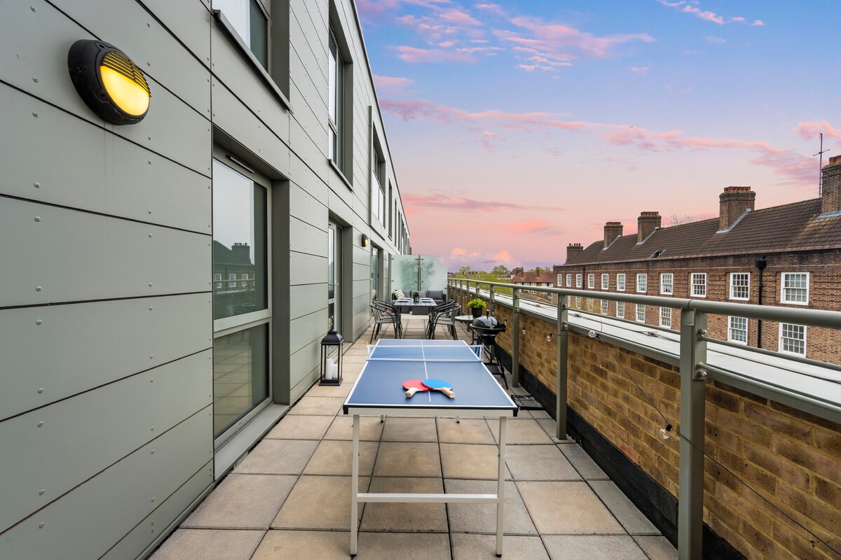 Bem-vindo a um duplex luxuoso e tranquilo no coração de Londres. Desfrute de uma vida lateral com uma enorme cozinha de chef e uma sala de jantar que acomoda 10 pessoas. Relaxe com uma televisão de 70 polegadas com Dolby Atmos ou saia para um terraço com uma churrasqueira e lareira. Cada um dos 3 quartos duplos tem casa de banho própria para máxima privacidade. A poucos minutos de Kings Cross, Granary Square e pérolas locais, como ótimos pubs e o Islington Tennis Centre. A sua estadia ideal em Londres está à sua espera!