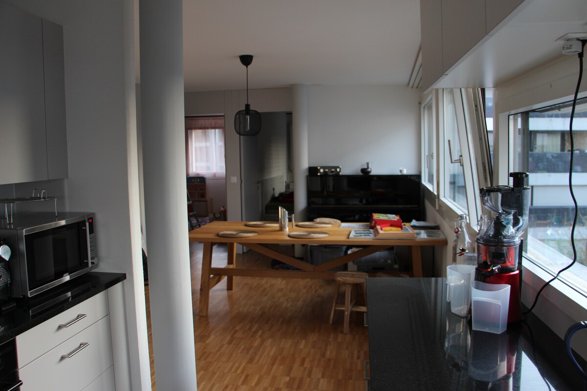 Le logement en entier est à la disposition du voyageur. L'appartement est situé à un endroit calme et paisible à proximité des commerces ( Coop, denner, migros, ...) des restaurants et pharmacies, mais aussi arrête des transports publics ( métro et bus). Je tiens à préciser que le logement ne dispose pas de parking place gratuit. Néanmoins les voyageurs en véhicule peuvent garer leurs voitures dans les parkings publics. Les places bleues sont gratuites. pour cela il faut avoir un disque