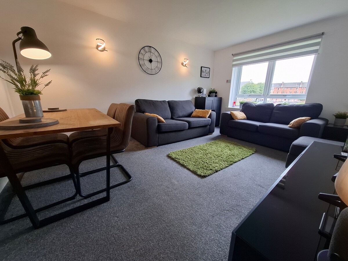 Modern 2 bedroom, 2 bathroom bright and spacious apartment decorated to a very high spec with superfast wifi Large open plan living area with partial views on to the River Clyde. Located in a trendy area suitable for Tourists, visiting family or Contractors, great transport links and fantastic local amenities FREE On street parking 15 mins drive to Glasgow Airport city centre & SEC, 45 mins drive to Loch Lomond & The Trossachs 3min drive to Braehead Shopping, Leisure & Entertainment Centre