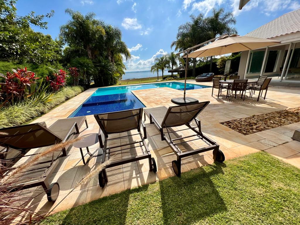 Casa com vista incrível para a Represa Ar-condicionado em todos os cômodos, incluindo sala 5 dormitórios, sendo 4 suítes, e comporta até 18 pessoas Banheiros com cromoterapia 2 escritórios (1 com ar); wi-fi excelente Quadra de Beach e Parquinho Infantil Privativo. Piscina: raia de 20m Jacuzzi: sob consulta Filtro de água e Nespresso Secador, roupa de cama, adega e cervejeira Iutúbi: "SC XIII – Casa 5 quartos, 4 suítes, 17 pessoas, Jacuzzi, Quadra de Beach, Churrasqueira, Piscina"