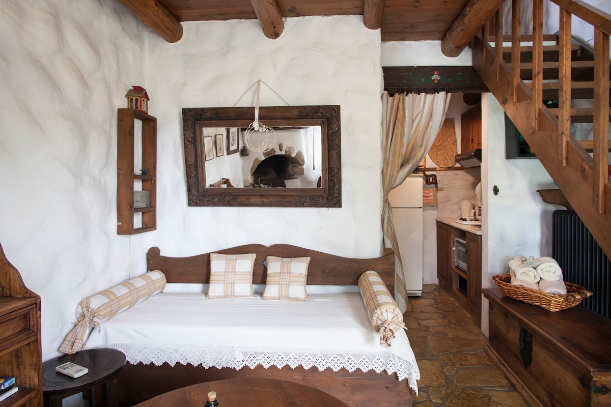 A antiga casa de pedra de Aristidis está localizada em uma pequena vila com 35 habitantes chamada Plouti, a 33 km da cidade de Heraklion. A casa tem 52 metros quadrados e pode hospedar até 4 pessoas. Há um quarto com uma cama de casal, (pode ser adicionado um berço). Na sala de estar, em frente à lareira, há um sofá-cama que pode ser usado por 2 pessoas. Há também uma sala elevada com uma cama de casal. O banheiro é espaçoso com um chuveiro aberto. Há também uma grande varanda.