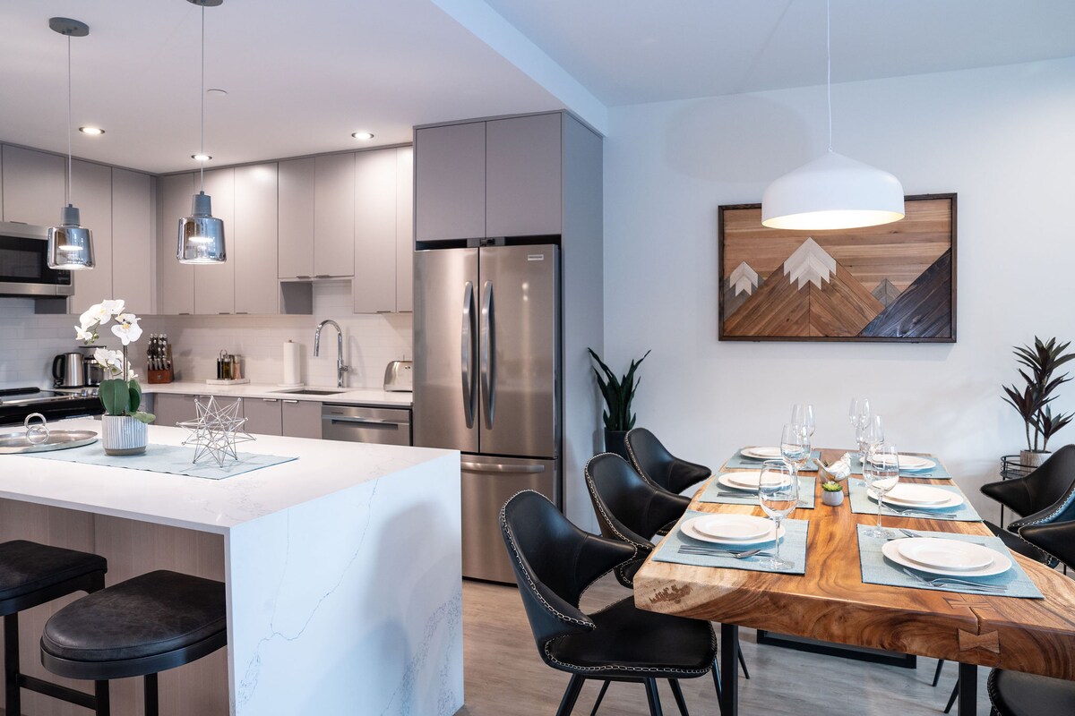 Modern 2 bedroom condo just 5 minutes to Revelstoke Mountain Resort and downtown. Set in a relaxed neighborhood within a convenient plaza, with a spa, gym, pilates studio, grocery store, liquor store, restaurant, daycare, and bakery all nearby. Enjoy a fully equipped kitchen, in suite laundry, and underground parking. Unwind on the spacious deck with mountain views, or relax indoors on the large sectional after a day of exploring. A comfortable, well located base for your stay in Revelstoke.