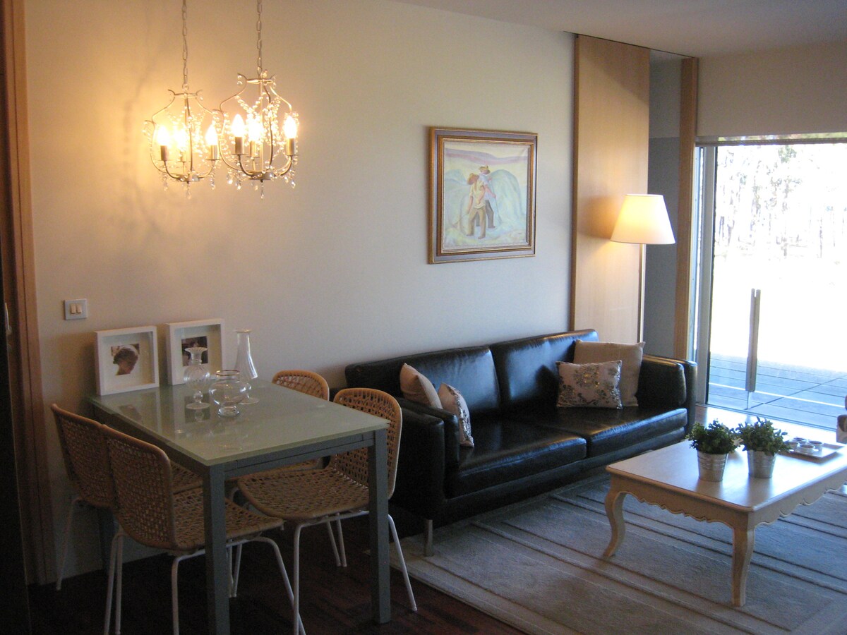 Apartamento amplo e luminoso localizado em uma urbanização exclusiva no meio de um pinhal na praia, com vistas incríveis para o mar e a floresta, de todos os quartos. Você pode ver o nascer do sol sobre o mar a partir da sala de estar e cozinha e como a cor do mar e da floresta muda ao pôr do sol a partir dos quartos. Caminhando pela porta de entrada que limita a urbanização, você estará no meio da floresta de pinheiros e uma caminhada de 2 minutos o levará a praias imaculadas e enseadas com águas azuis cristalinas.