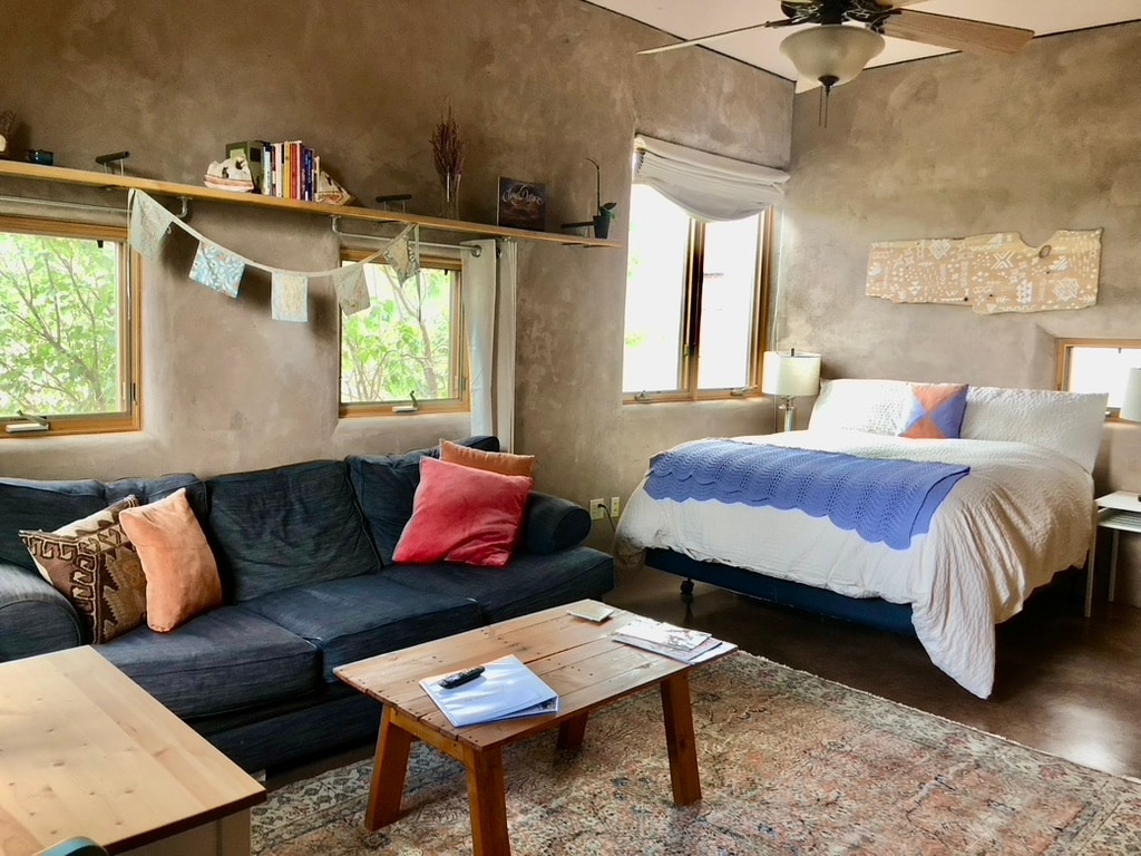 Uma suíte de hóspedes tranquila com entrada privativa, banheiro completo, cozinha pequena e cama queen super confortável com pillow top. Apenas 2 milhas da praça Taos e a 35 minutos do Taos Ski Valley. Vista deslumbrante para a montanha Taos a partir do seu espaço privativo ao ar livre. Desfrute de estacionamento gratuito, Wi-Fi de fibra óptica de alta velocidade, Netflix e Amazon Prime. Café e chá fornecidos. Mergulhe na serenidade da montanha a poucos minutos do centro da cidade em uma casa projetada e construída por um arquiteto treinado em Arcosanti.