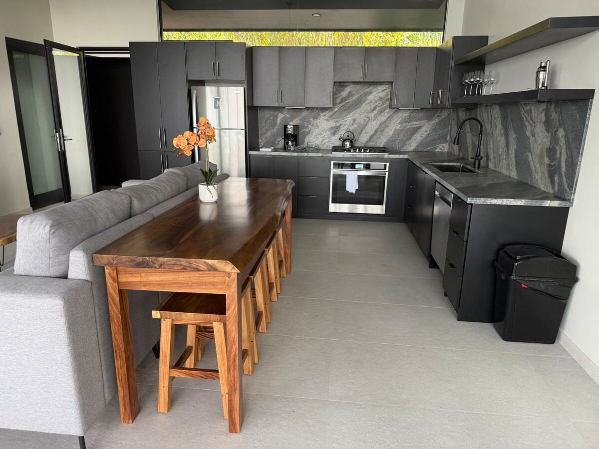 Adormeça e acorde com o murmúrio suave de um riacho da floresta tropical próxima, ondas do mar distante e pássaros tropicais em copas de árvores resplandecentes. Este moderno, mas aconchegante 1 quarto/1 banheiro vem com todos os itens essenciais de cozinha, churrasqueira e um banho de luxo com vista para a selva e chuveiros duplos. Saia e entre na piscina de borda infinita com iluminação personalizável e vista para o mar. Macacos, preguiças, tucanos, quatis e cachoeiras abundam. Cerque-se de beleza natural serena e vibrante.