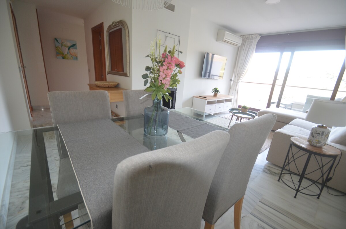 Acorde com o céu azul e vistas deslumbrantes para o mar a partir do seu terraço privado🌊. Desfrute de pores do sol dourados, de um copo de vinho ou de banhos de sol em privacidade. Este apartamento luminoso em Pueblo Paraiso fica a apenas 12 minutos das praias, do golfe e do centro histórico de Marbella. Wi-Fi rápido, camas confortáveis, cozinha equipada, piscina infinita e terraço para observar as estrelas ou jantares ao pôr-do-sol. Perfeito para casais, famílias ou trabalho remoto. Adequado a crianças com acesso a parque infantil nas proximidades