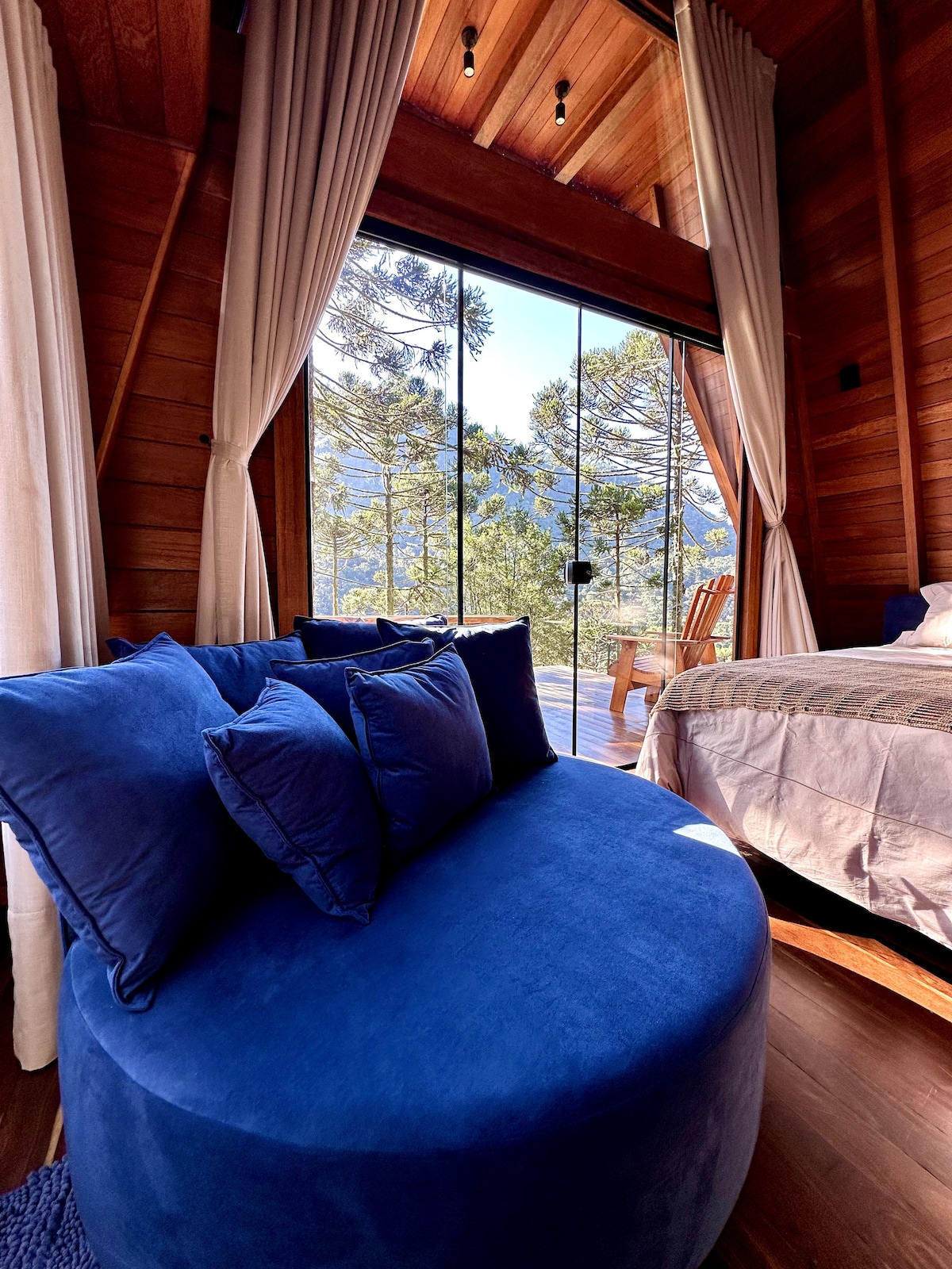 Nossa cabana é ideal para pessoas que buscam uma estadia de tranquilidade, aconchego e conforto. O ambiente integrado oferece requinte, praticidade e conexão com a natureza. Ao entrar, você será recebido por uma atmosfera acolhedora, com detalhes cuidadosamente planejados. Com o frio característico da região, o piso aquecido da cabana garante conforto térmico em todo o ambiente. As amplas janelas de vidro oferecem vistas deslumbrantes da natureza circundante, inundando o espaço com luz natural.