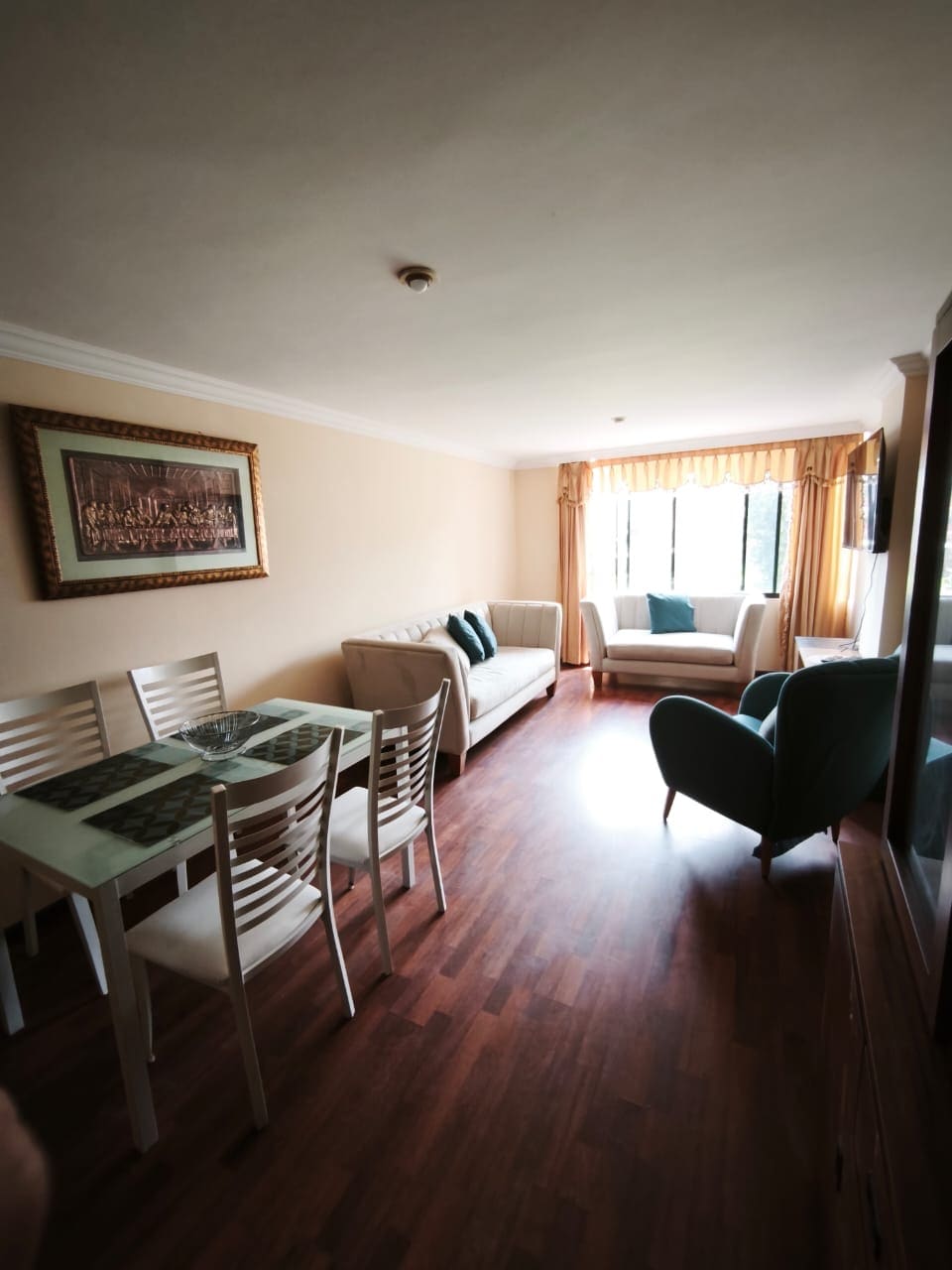 Apartamento confortável e moderno a norte da cidade, situado numa zona residencial tranquila e segura. A dois quarteirões da Av. República e a 5 minutos da saída para Quito. Perto de centros comerciais, restaurantes, parques e de todos os serviços de que precisa. Ideal para viagens de negócios, fins de semana ou férias. Espaçoso, confortável e perfeito para desfrutar em família ou para descansar em privacidade. Apenas a 10 minutos de carro do centro da cidade. Excelente iluminação natural e atmosfera acolhedora.