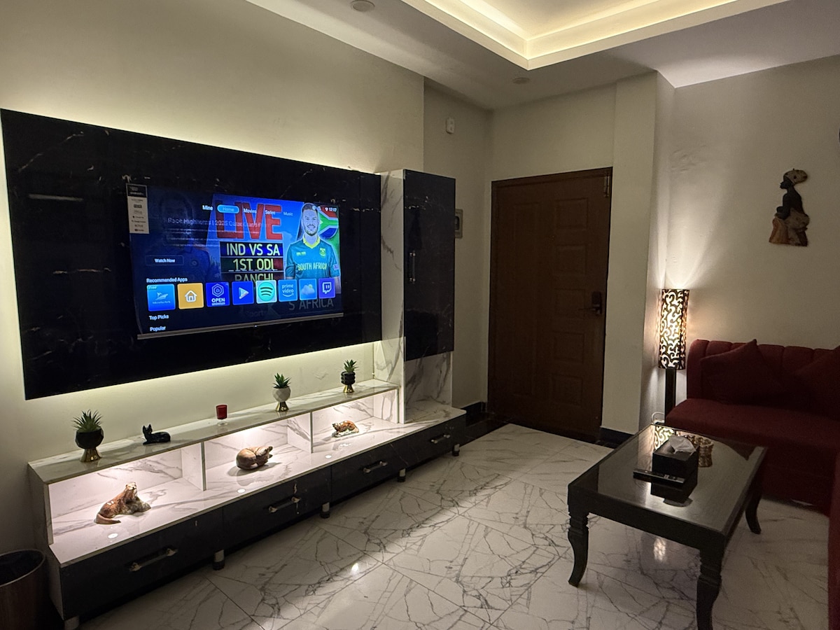 Entre nos apartamentos de 3 quartos do Flamingo Grand, os apartamentos de serviço mais sofisticados e esteticamente emocionantes de Islamabad. Curta uma experiência segura e elegante neste lugar bem-localizado. Se você está visitando Islamabad por prazer ou trabalho, nós do flamingo garantimos uma experiência 5 estrelas. Os hóspedes também desfrutam de um estacionamento gratuito e seguro dedicado, Wi-Fi gratuito e experiência de visualização de suas séries de TV favoritas no LED inteligente de 65 polegadas.