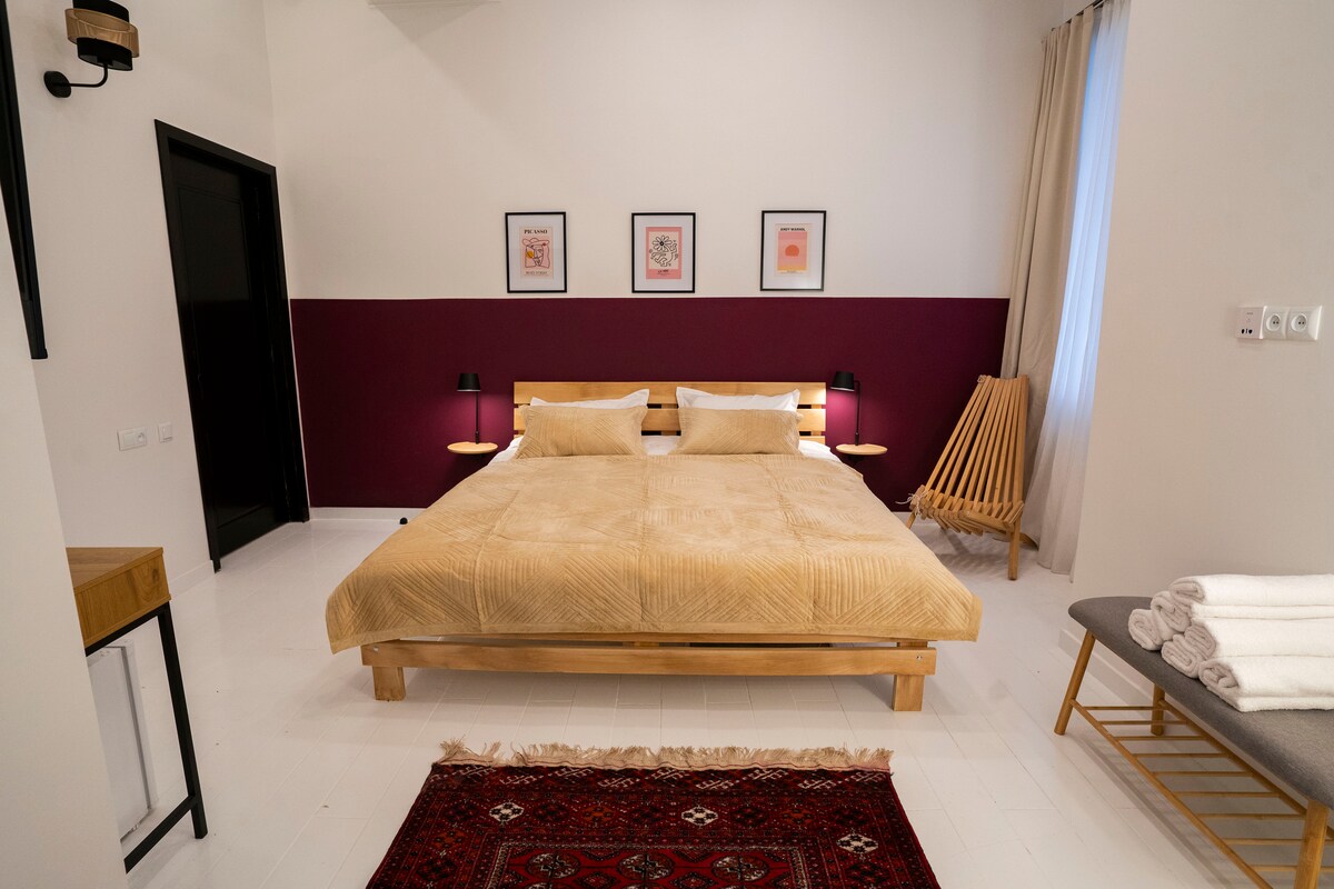 The apartment's unique features are its large expanse, modern design, thick walls, hand-painted murals, and artwork. Great location on one of the most beautiful streets, very cozy. Previously, this apartment was an art gallery, where exhibitions were held. I tried to give an artistic look to the apartment and make it spacious. The apartment is at first floor and has isolated entrance from Machabeli street. Another entrance is from backyard. Space is 102 square meters.