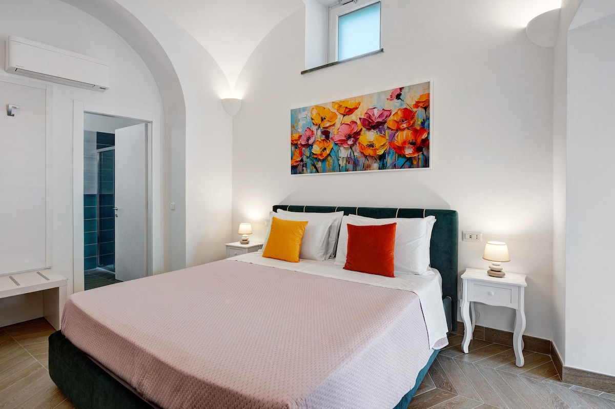 Casa Titì is a heaven of comfort in a prime location overlooking the Gulf of Naples and the natural landscapes of the Amalfi Coast. The interiors feature two custom designed double bedrooms with private balconies, modern bathrooms and a contemporary living space with a double sofa bed and a fully equipped kitchen and dining area overlooking the Mediterranean Sea. The interiors open out onto a rooftop terrace featuring lounging furniture, a dining table and a jacuzzi surrounded by century-old oli