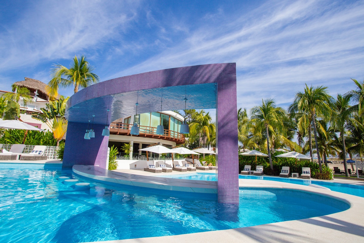 Estúdio localizado dentro do hotel à beira-mar em Sayulita; com tudo o que é necessário para tornar a estadia perfeita em Sayulita: cama king size, ar condicionado, Wi-Fi super rápido gratuito ideal para trabalhar online ou coworking, piscina grande, piscina para crianças, frente para a praia, estacionamento e a sua melhor localização em Sayulita. A unidade não tem vista para o mar