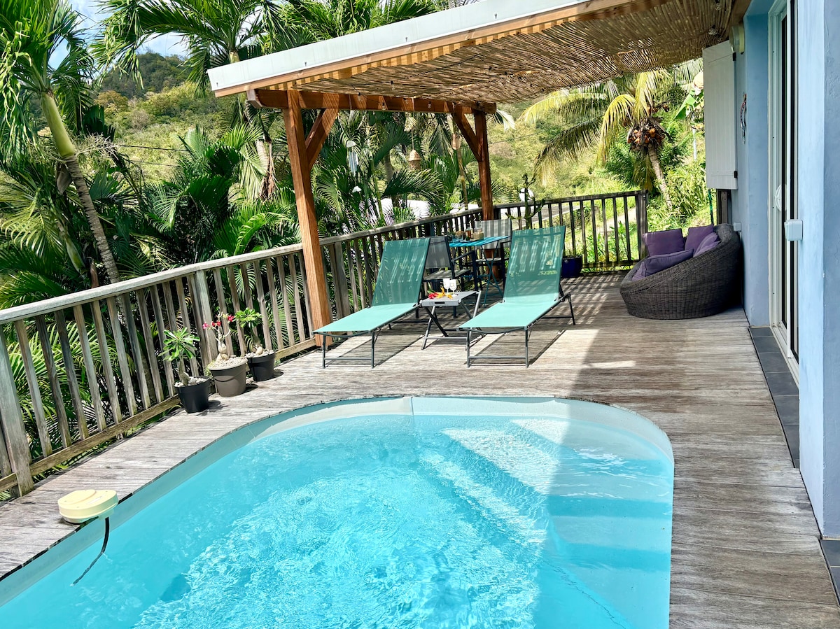 ESTADIA GLYCERIA Belo refúgio de paz no fundo de uma moradia independente com a sua piscina privada e vista desobstruída para o campo com o mar como pano de fundo. Localizado nas alturas de Le Marin, estará a apenas 10 minutos das praias mais bonitas da ilha. Há também um campo de petanca e um cesto de basquetebol. As bolas e a bola estão no local! 🏀