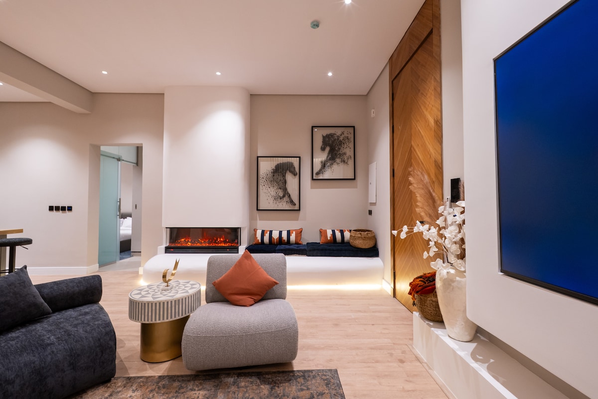 Modern 1BR in Hittin, one of Riyadh’s prime locations, minutes from Boulevard City and top cafes. Designed for comfort and ease with self check-in and a full smart system. Features a cozy living area, comfortable bedroom, 85” Smart TV, and an elegant electric fireplace for a relaxing atmosphere. Fully equipped kitchen with oven, microwave, electric stove, dishwasher, and washing machine. Clean, stylish, and ideal for couples, business travelers, and short or extended stays.