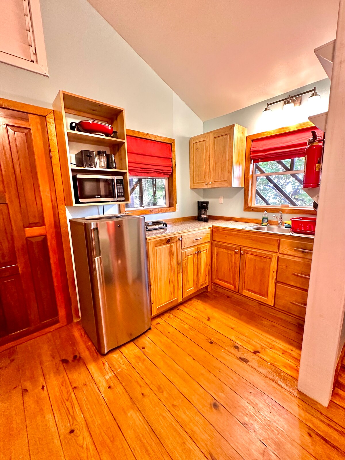 O Gecko é um bungalow privado autónomo com um quarto, uma casa de banho e uma área de estar separada. Também tem uma cozinha de tamanho normal. A casa de banho é lindamente revestida de azulejos com um chuveiro de entrada. A área de estar tem um sofá e uma cadeira confortáveis com uma mesa de jantar com 4 cadeiras. O quarto tem uma cama queen com almofada; armazenamento de roupas embutido, ar condicionado silencioso e uma ventoinha de teto. O Gecko tem um alpendre coberto privado, com cadeiras e vista para a selva.