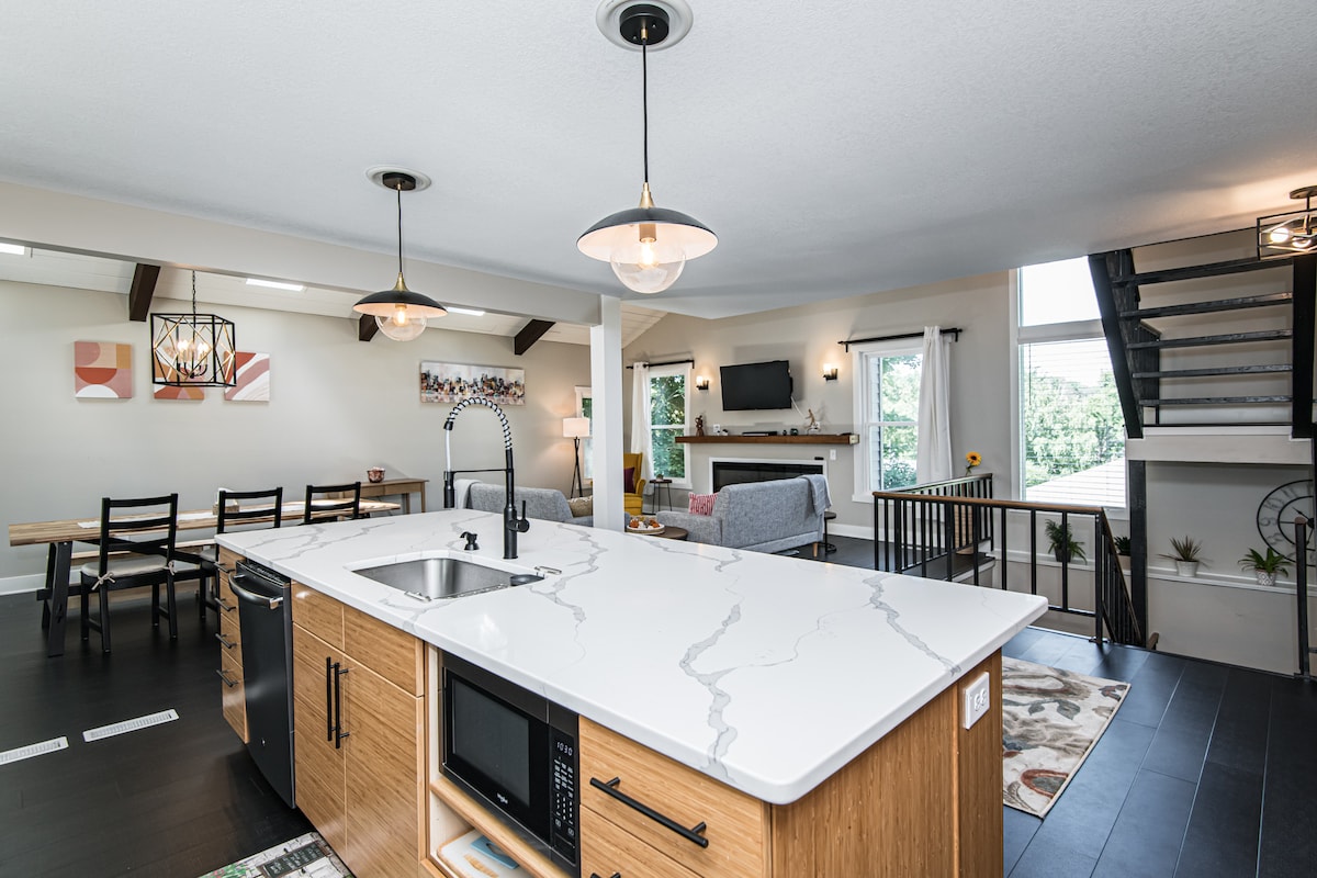 - 5 minutos a pé da Mayo Clinic, campus de St. Mary - 3 quartos, 3 banheiros e um loft - design exclusivo com teto abobadado e clarabóias no estilo de Frank Lloyd Wright, um dos seus tipos em todo o bairro - garagem para dois carros + outra vaga de estacionamento dedicada do lado de fora - bairro familiar, seguro e perto do centro da cidade e de todas as comodidades - pátios externos frontais e traseiros - Mesa de futebol - espaço de trabalho exclusivo - Wi-Fi de alta velocidade - Apple TVs - Lavadora e secadora