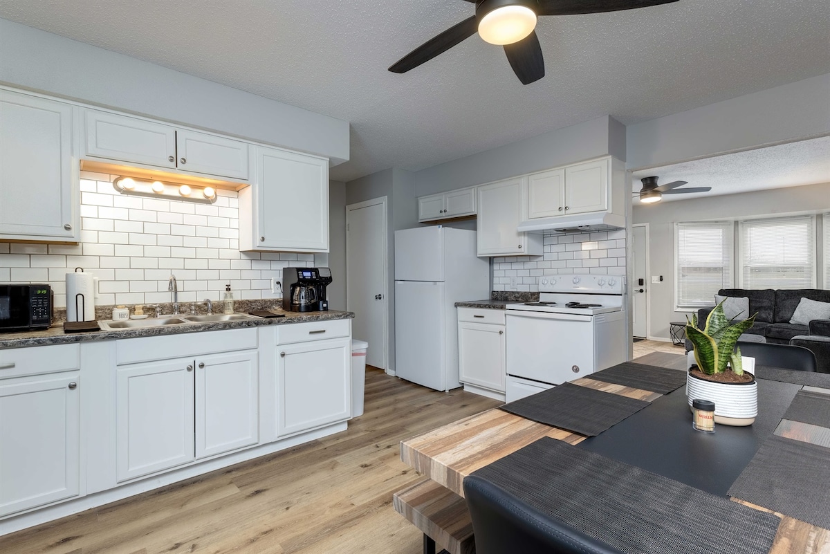 Spacious 4BR/2.5BA duplex (left side) in Davenport, IA, perfect for 10-12 guests. Features 2 king beds, 1 queen, 2 full beds, and a queen pullout sofa. Enjoy a 55" Samsung Smart TV in the living room, and smartTVs in the 3 bedroom, Capcom arcade, 1GB Wi-Fi, work space, central AC with Nest thermostat, and in-unit washer/dryer. Relax on the private back deck or in the shared backyard. Driveway parking for 2 cars (no street parking).Ideal for work crews or groups seeking comfort, near I-80 and loc