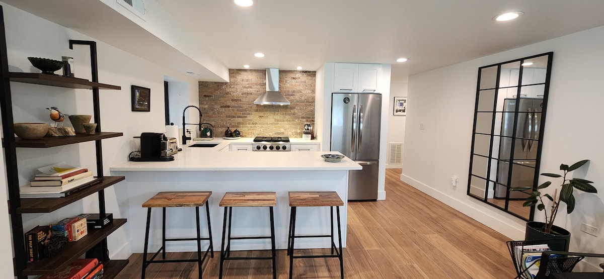 Este apartamento com jardim fica dentro da casa principal. Seu apartamento aconchegante tem sua própria entrada com um quarto de tamanho agradável com cama queen size, juntamente com uma sala de estar com uma mesa de centro, um novo sofá aconchegante Crate and Barrel que pode acomodar um terceiro hóspede, banheiro com um chuveiro e uma sala de escritório com uma mesa, frigobar ABASTECIDO e estação de café/chá e mini forno. O estacionamento fechado gratuito também estará disponível 24 horas por dia, 7 dias por semana.