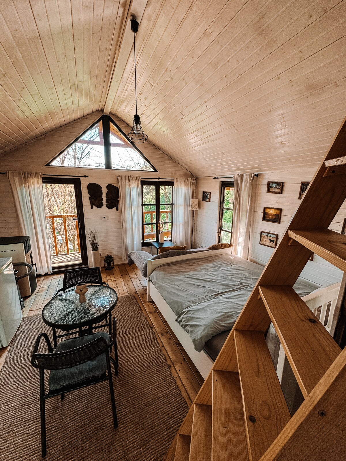 Situado entre as árvores, o Loft Treehouse é um refúgio apenas para adultos para paz, privacidade e reconexão. Concebido para casais, combina madeira natural, luz suave e ar da montanha numa escapadela serena. Desfrute do café da manhã na sua varanda e de noites tranquilas junto à lareira. Características: Estufa a pellets • Wi-Fi rápido • Varanda • Área de churrasco • Café • Trilhos para caminhadas • Estacionamento
