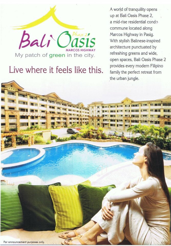 BALI OASIS 2-Bedroom Condo Unit (FULLY-FURNISHED) Comes with: Split Type Aircon for the 2 Bedrooms Brand new furniture and appliances Flat screen 36” TV Water Heater Kitchen Cabinets, Dresser Cabinets to make it easy for you to transfer immediately and have a comfortable living. Contract Terms: PhP 27,000 / month (including association dues and excluding utilities) 6 Months minimum, 2 Months deposit, 2 Months advance BALI OASIS Condo in Marcos Hi-way, Santolan Pasig! A mid rise condo by Filinvest Land in 1.8 Hectares Prime Area composed of 4 buildings and an open area in the center for the sprawling resort amenities. Location and Accessibility Located along Marcos Highway Highly accessible via PUVs (jeeps,buses, FX. Etc) is in proximity to Santolan LRT2 Less than 5 minutes from major commercial establishments (Sta. Lucia East Grand Mall, Robinson's Metro East and SM Marikina) Less than 15 minutes from major schools and universities (St.Bridget’s School UP Diliman, Ateneo de Manila University and Miriam College) Feel the refreshing living amidst the city life and relax in the tropical green setting of trees, gardens and large open areas of pools, gazebo and playground. Your family will surely enjoy a day of swimming, barbeque picnics and family bonding that you never experienced in a typical condo before! The community is a trains ride away from the countrys top colleges and universities and also the business districts of Ortigas and Makati. Amenities Clubhouse with Entertainment Rooms Gym Swimming Pool Children's Play Areas Gazebos Buildings 4 mid-rise buildings Each building: 5 storeys high Roof deck: laundry cages (packaged with the unit) Basement: provision for storage (for lease) Elevators: 2 per building Corridors: single loaded for max. lighting and ventilation Total Units for Building A: 160 units AREA FOR DEVELOPMENT Total Area: approximately 1.8 hectares 60% of the development: allocated for facilities and open spaces Project Theme Balinese themed development