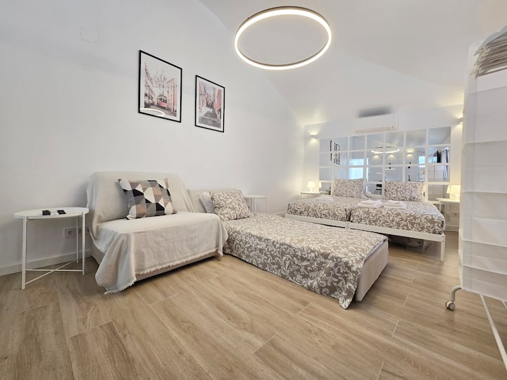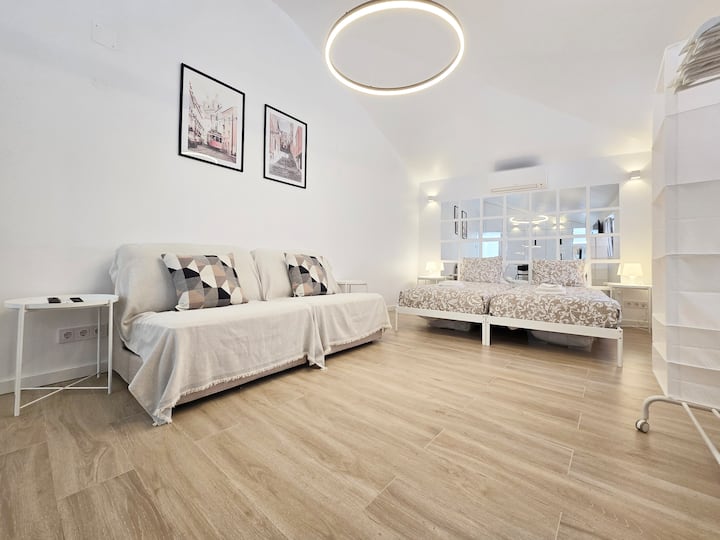 - O apartamento é um open space composto por uma sala/quarto, uma kitchenette e duas casas de banho (1 WC social e 1 WC completo).