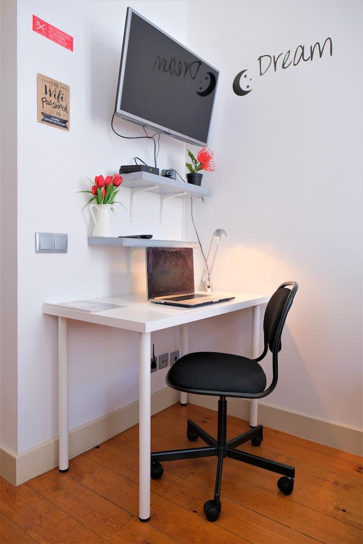 Um quarto com Wi-Fi, adequado para trabalhar.