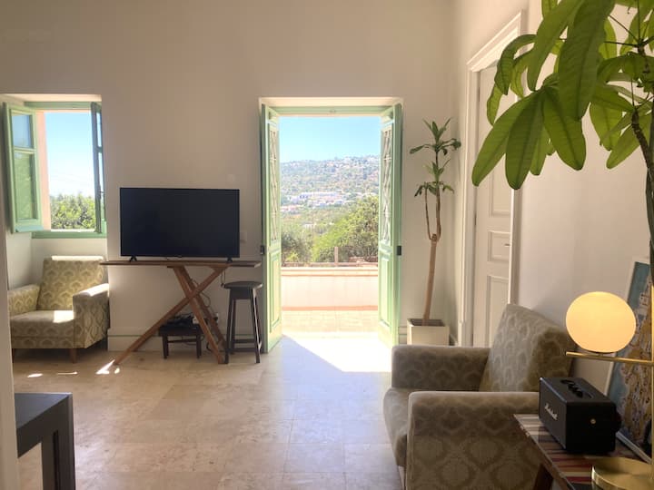 A decoração de estilo retrô de tom neutro e minimalista, bem como o jardim que cresci, cheio de cantos e caminhos para descobrir, naturalmente o ajudarão a relaxar e desfrutar das muitas sombras aqui e ali enquanto esmalta os seus olhos e alma com as suas vistas deslumbrantes, através da ondulação das montanhas cobertas de verde e do oceano visto à distância.