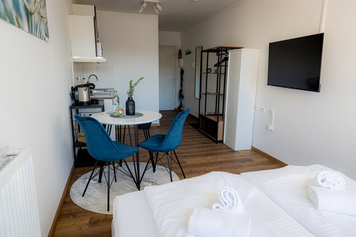 Os apartamentos de 2 quartos do tipo 2 consistem em áreas de estar e de dormir separadas. A kitchenette está separada da sala de estar e do quarto. Também estão equipados com televisão por satélite, chuveiro/sanita separados, acesso Wi-Fi gratuito e telefone fixo. Na sala de estar, há um sofá-cama que pode ser usado para 1-2 crianças dormirem confortavelmente. Estes apartamentos estão localizados no lado sul da nossa casa e no lado do jardim com vista para o campo.