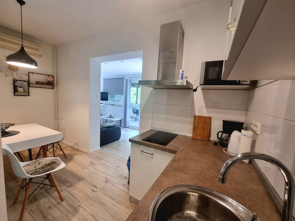 Completamente recém-decorado e feito apartamento estúdio de 30m2, quarto, cozinha e sala de estar em um espaço com casa de banho separada e um agradável terraço íntimo. O apartamento tem ar condicionado e está completamente recém-decorado e equipado. O espaço perfeito para descanso e relaxamento. Além disso, dentro do apartamento temos duas bicicletas e toalhas de praia. Claro, se os hóspedes quiserem treinar, temos dois tapetes de exercícios.