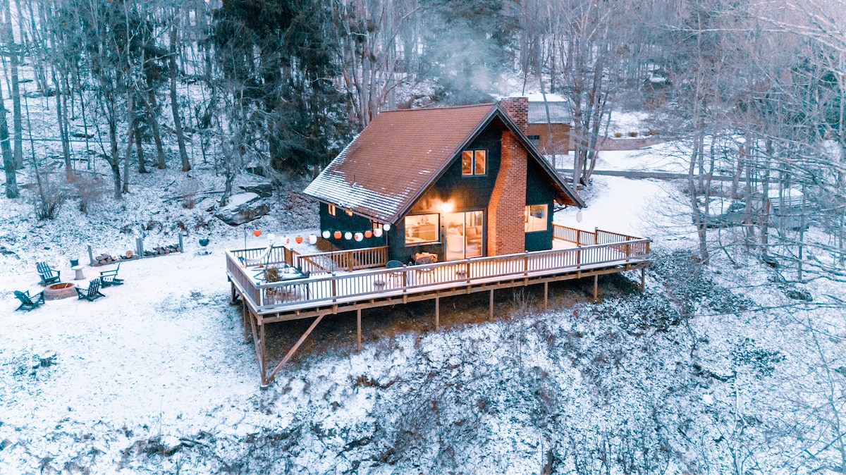 Aninhado entre árvores Hemlock e a poucos passos de uma cachoeira de 30 pés está o nosso acolhedor chalé com estrutura em A. Situado em 33 acres privados conectados a terras estaduais, desfrute de vistas para a cachoeira enquanto saboreia um café em frente à lareira. A casita foi intencionalmente projetada para parecer um lar longe de casa. No verão, refresque-se nas cachoeiras e riachos privados, no outono aprecie a folhagem deslumbrante e no inverno esquie/pratique snowboard em Belleayre (a 25 minutos de distância). A pescaria no Lago Alder e no Reservatório Pepacton fica a 10 minutos de carro.