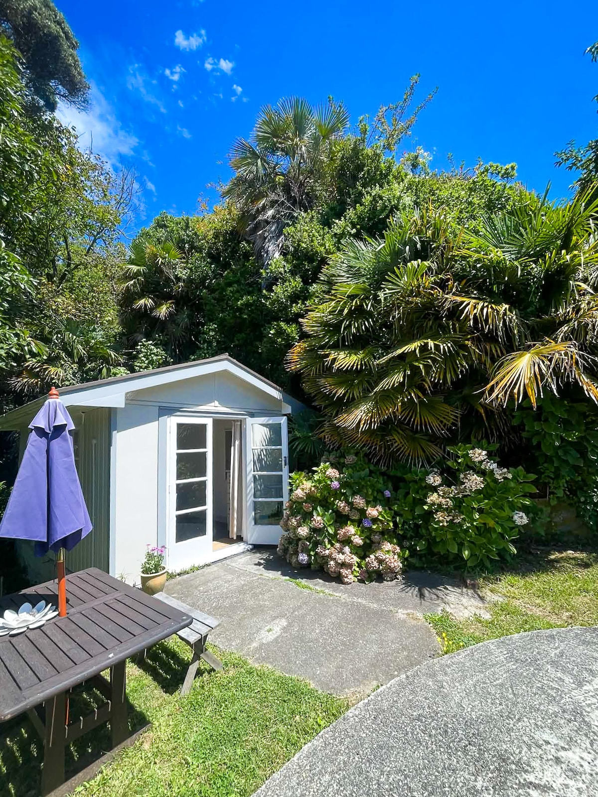 This is our sleepout located next to our family home. It is artistic and peaceful. It is nestled within a 1 ha property with established fruit trees and many things for families to do and play. The sleepout has a separate wash space/kitchenette and bathroom, about 7 metres away from the sleepout. The beach is right opposite the house, and Mapua is a 2-minute drive. It's an ideal space to land in before and/or after a hike in the Abel Tasman, which is only 30 minutes away from us.