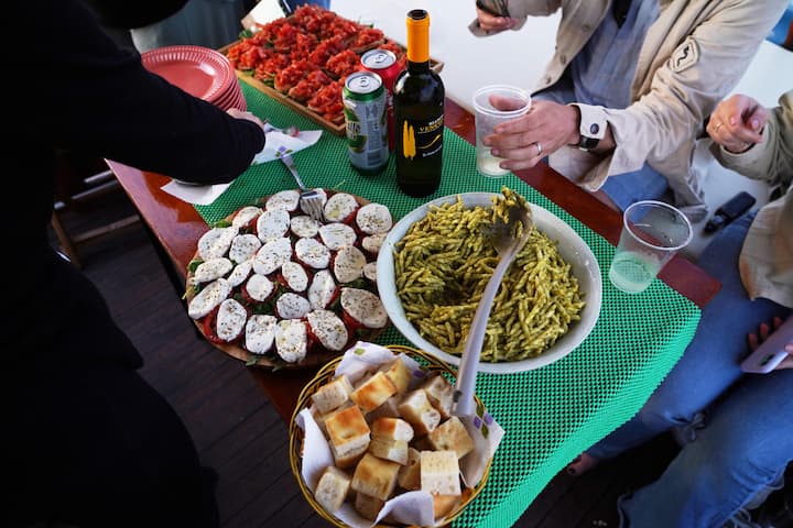 Aperitivo ao pôr do sol em um barco