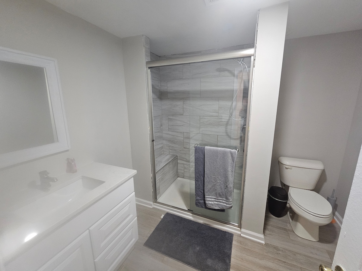 Nossa bela suíte de hóspedes de 2 quartos em Stone - Nova construção, é apenas um 3 minutos de carro do Hospital Memorial Wayne, Wayne Community College, mercearias, restaurantes e cafés. 12 minutos de carro da Força Aérea Seymour Johnson. Nova construção em bairro familiar. Wi-Fi. Smart TVs no quarto e na sala de estar. Cozinha completa, sala de estar, 1 banheiro, mesa de jantar, máquina de lavar e secar roupa, HVAC central, cafeteira, torradeira, utensílios de cozinha, ferro e muito mais!