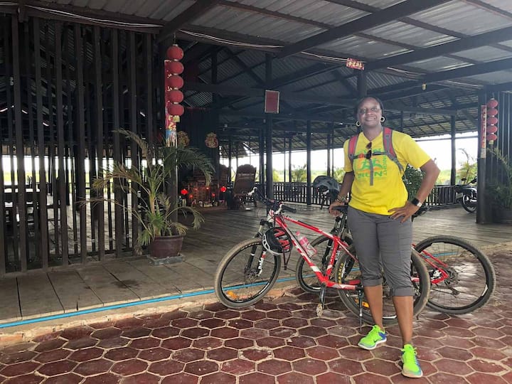 Aldeia flutuante: bicicleta e barco ao pôr do sol