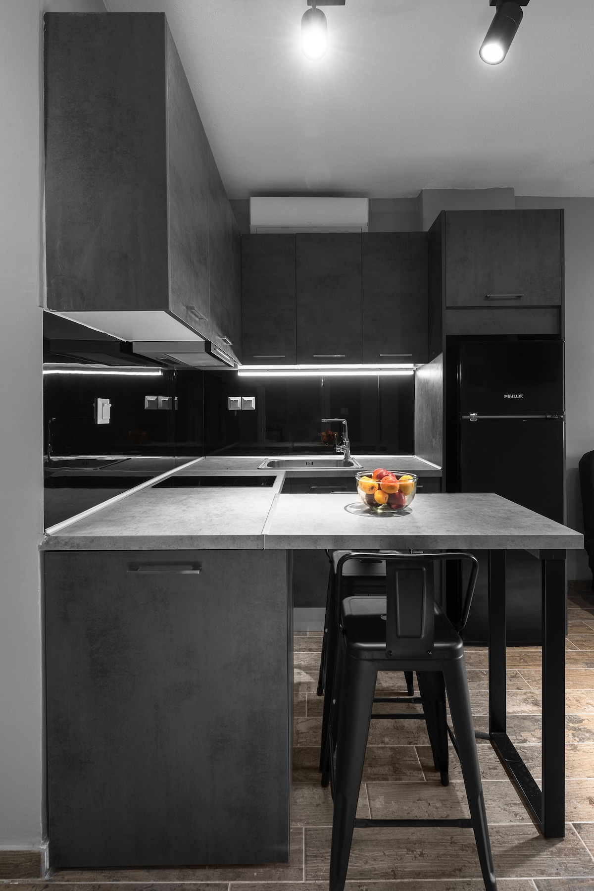 um apartamento com um quarto, casa de banho e cozinha, 25 m ² no total. O quarto tem duas camas individuais ou uma cama de casal, está equipado com ar condicionado, TV LED de 32'', canais por satélite, secador de cabelo e Wi-Fi. A cozinha está totalmente equipada.
