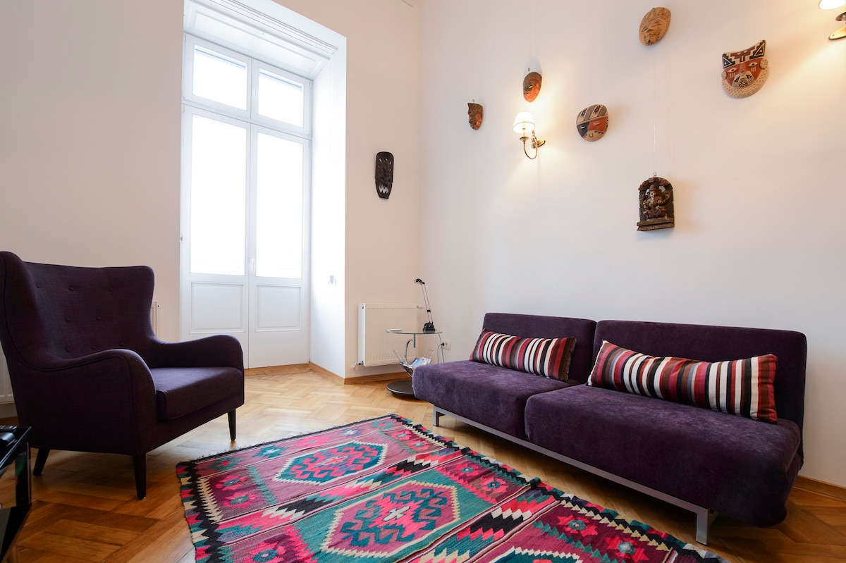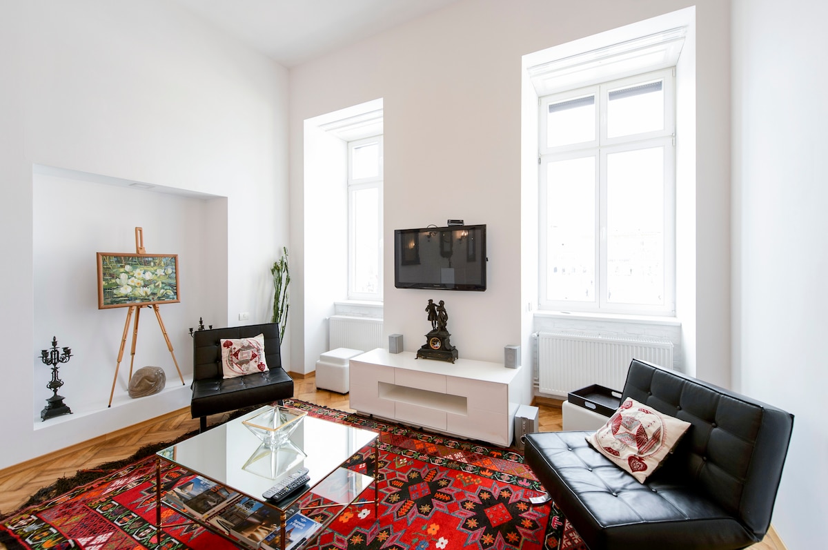 Este apartamento de 52 m ², recentemente redesenhado e mobilado, está localizado no coração da Cidade Velha de Brasov - Piata Sfatului. O apartamento reside num edifício de 1890, a Casa Mandl, e tem uma vista deslumbrante da praça, com a Igreja Negra (Biserica Neagra) à esquerda e a Casa do Conselho (Casa Sfatului) à direita. O apartamento está localizado no 1º andar (com código de porta, sem elevador) e apresenta tudo o que se pode exigir para uma estadia de luxo em Brasov. A sala principal tem 28 m ² e uma sala de estar com um sofá e duas poltronas, TV HD de 42 polegadas com satélite (mais de 100 canais, incluindo inglês, alemão, italiano, russo), acesso Wi-Fi, área de cozinha totalmente equipada com eletrodomésticos Miele (frigorífico, máquina de lavar louça, forno de micro-ondas, fogão elétrico), área de jantar para até quatro pessoas e muito mais. O apartamento tem uma pequena varanda pendurada sobre Piata Sfatului. Pegue na sua cadeira e reserve, saia na varanda e desfrute do sol e da atmosfera animada da praça. O apartamento também possui um loft encantador de 13 m ² onde o quarto está localizado. A casa de banho é coberta com calcário Vratza de cor quente e tem um design minimalista. Inclui WC e lavatório ViIleroy&Boch e um chuveiro Hansgrohe Raindance. Tudo no interior é novo e topo de gama feito em estilo de renovação moderno. Este apartamento é o máximo de luxo que Brasov tem para oferecer na localização central absolutamente encantadora. Para turistas americanos, os plugues de parede padrão de 110V dos EUA estarão disponíveis em todo o apartamento. Este apartamento estúdio ultra luxuoso e recentemente renovado está localizado no coração do bairro histórico de Brasov, mesmo ao lado da praça principal de Piata Sfatului e perto de todas as atrações do centro de Brasov, incluindo a conhecida Biserica Neagra, que fica do outro lado da praça. Dezenas de restaurantes, cafés e discotecas estão nas proximidades. Esta casa pertence a um conjunto de três apartamentos que ocupam o primeiro andar do edifício. Os três apartamentos (https://www.airbnb.com/rooms/1035209, https://www.airbnb.com/rooms/1517986) podem ser alugados em conjunto, comunicando uns com os outros. O apartamento prolongado de 220 m ² resultante pode hospedar uma festa de 8 a 10 pessoas.