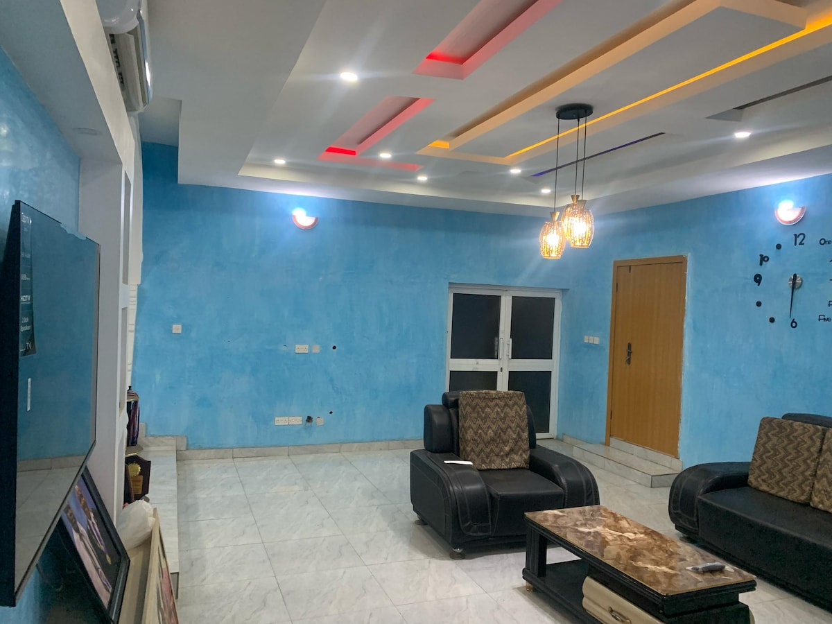 Com preços para estadias prolongadas, Internet Wi-Fi de fibra, três (3) aparelhos de ar condicionado, água quente, sistema de inversor solar, camas grandes e seguras, quintal privado, estacionamento privado, cozinha espaçosa, parque infantil, smart TV, árvores/madeira nas proximidades para respirar ar fresco e muito mais. Relaxe com toda a família neste lugar tranquilo. Espaço de trabalho/secretária adequado no local. São fornecidas unidades de eletricidade no valor de 10 000 NGN no check-in, após o qual o hóspede será responsável pelo custo da eletricidade.