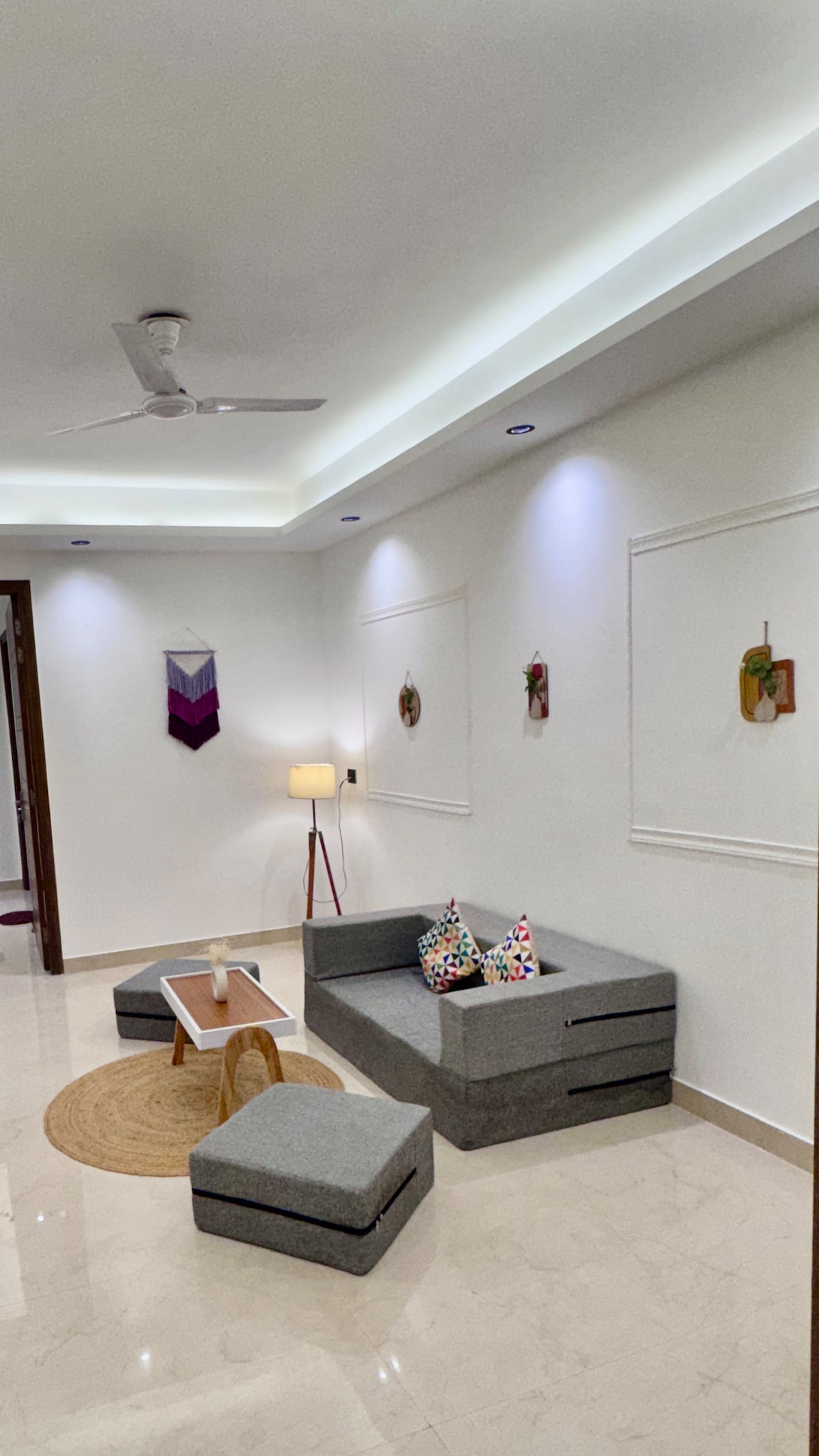 Lune é um 2BHK no rés-do-chão criado para a calma e a criatividade. Uma parede de lua texturizada e um sistema de iluminação magnética móvel definem um tom cinematográfico, enquanto um ar condicionado de cassete mantém a sala de estar perfeitamente fresca. Dois quartos, duas casas de banho (uma privativa) e uma cozinha totalmente equipada permitem estadias mais longas. Uma smart TV de 55 polegadas com subscrições, Wi-Fi de 200 Mbps e alimentação por inversor mantêm o streaming e o trabalho sem problemas. No sul de Deli, perto de Dhan Mill, o Lune by Vyagram Experiences é acolhedor, moderno e pronto para receber.