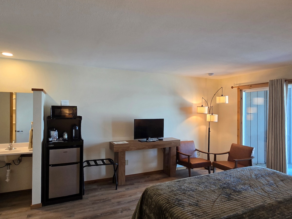 Welcome snowmobilers! We have plenty of trailer parking, ride snowmobile right up to your door, trail 5 just seconds away, and hot food at Trap N Fish Lodge across the road! Ask us how you can rent the entire motel for large groups for a discounted rate! Room 7 is a cozy studio room perfect for the solo fishermen coming up for the week or a couple looking for a weekend get away. Includes queen bed and futon to sleep up to 3 comfortably. Kitchenette, soap and towels, wifi, and Roku.