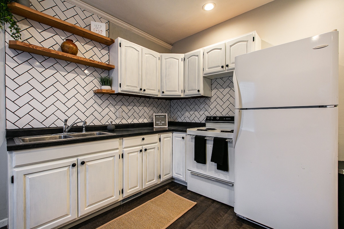 Olá! Este apartamento histórico foi completamente renovado. Possui tijolos originais expostos e pisos de madeira. Este quarto está equipado com uma confortável cama queen, Roku TV com uma variedade de canais por cabo e uma cozinha (completamente equipada com forno, fogão, micro-ondas e frigorífico). Esteja à vontade para usar qualquer um deles! Canalize o seu cozinheiro interior! A casa de banho tem um chuveiro e uma banheira. Veja todos os nossos anúncios em Airbnb.com/p/galenaapartments (copiar e colar no URL)