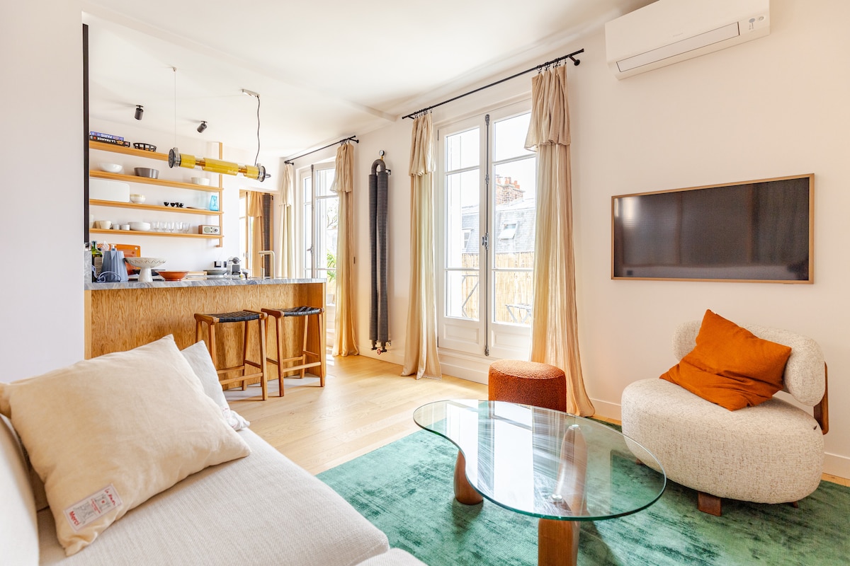 Situé au cœur de Montmartre, entre la rue des Abbesses et la rue Lepic, cet appartement haussmannien climatisé de 50m2 offre une cadre épuré et contemporain. Avec deux chambres et un bel espace de vie comprenant une cuisine ouverte, l’appartement permet de beaux moments de convivialité. Rues pittoresques, excellents restaurants, delicieuses boulangeries, plusieurs lignes de métros à quelques minutes, tout est réuni pour passer un excellent séjour dans le quartier le plus charmant de Paris!