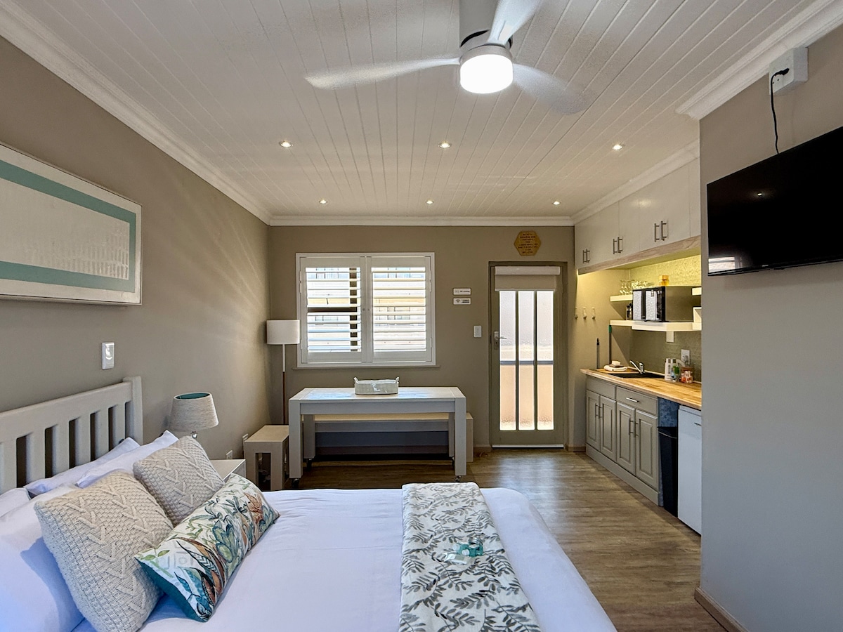 Our apartments are sanitized between every guest departure and arrival by me personally. I hope this may allay any fears you may have. Please do not hesitate to contact me for any further information. Beautiful upstairs Bachelor's unit with Limited Sea Views , queen bed, kitchenette, en-suite bathroom with shower and SHARED patio with outside braai/barbecue. Situated approximately 80m from the beach and Voorstrandt 'red roof' restaurant. Has WIFI available .