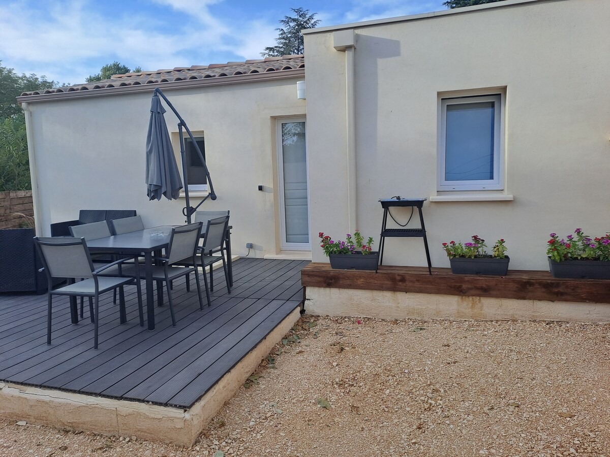 Ce logement,indépendant,paisible, avec sa terrasse,sa pergola et son jardin privatif,offre un séjour détente pour un couple ou une petite famille ayant besoin de soleil,de repos,et de baignade dans une belle piscine, ouverte de début mai à fin septembre. Le logement est tres bien équipé, cafetière filtre, bouilloire,four,four micro onde,plaque de cuisson, machine à laver,TV,internet haut debit, climatisation,literie de qualité,draps et serviettes et torchons fournis. une supérette ouvre bientôt