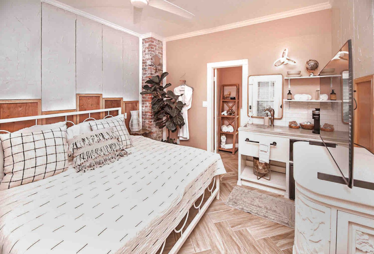 Bem-vindo ao quarto Ponce de Leon no The Blue Carriage House! Esta suite de inspiração histórica tem uma CAMA KING, COZINHA totalmente equipada, CASA DE BANHO privativa e um sofá-cama que se transforma numa cama de tamanho completo. Localizado a apenas um quarteirão da St. George Street, estará a poucos minutos da orla da Baía de Matanzas, do Castillo de San Marcos e da Ponte dos Leões. Com o nome do lendário explorador Juan Ponce de León, este quarto convida-o a descobrir os tesouros de Santo Agostinho.