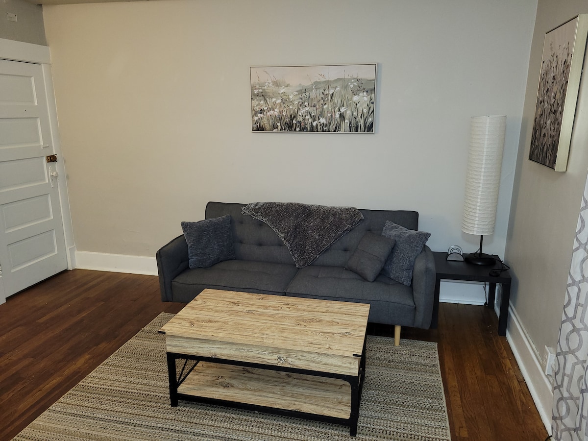 Apartamento com um quarto completamente mobilado! Apenas a uma curta hora de carro a norte de Kansas City e a 32 km a leste de Saint Joseph! Localizada na pequena cidade de Stewartsville. Duas adegas e um produto lácteo (Shatto Milk Co.) nas proximidades. O quarto tem uma cama king size espaçosa e a sala de estar tem um sofá-cama queen. As comodidades incluem máquina de lavar, secar roupa, Wi-Fi rápido e uma televisão de ecrã plano de 65".